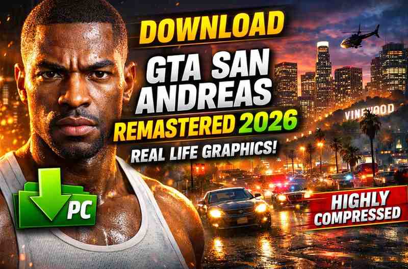 GTA San Andreas Remastered is a next-generation enhanced version of the legendary open-world action game. This 2026 Remastered Edition features ultra-realistic graphics, 4K textures, improved lighting, enhanced shadows, and smooth performance optimization for modern PCs.